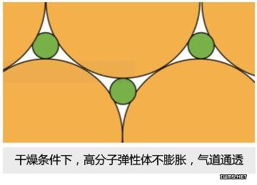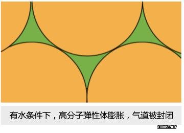 此种滤芯是通过特殊工艺,将高分子弹性体嵌入到PE烧结滤芯孔状结构中而得到的,在干燥情况下,高分子弹性体不膨胀,PE网络之间的气道保持高通气性,接触水分后,高分子弹性体迅速膨胀,堵塞孔状结构,气道被封闭,水溶液无法通过。